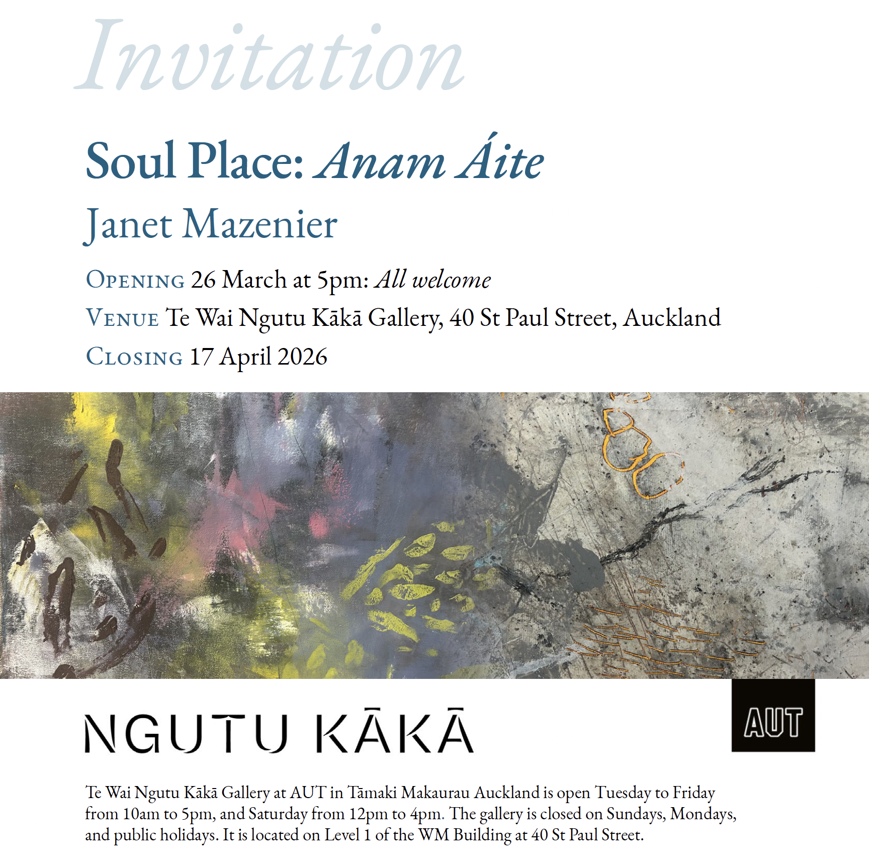 Opening at 5pm on 26 March 2026 my PhD exhibition Soul Place: Anam Áite will open to the public. Please come along to Te Wai Ngutu Kākā Gallery 2, Level 1 of the School of Art and Design (WM) building at 40 St Paul St. All welcome